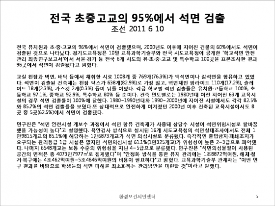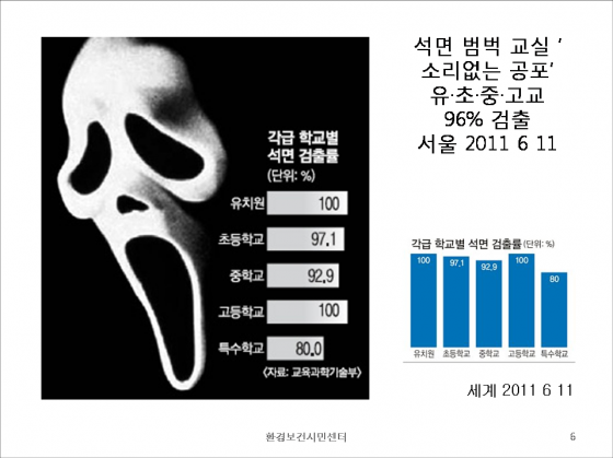 ÀÌ·± À§ÇèÇÑ ¼®¸éÀÌ ¸ðµç Çб³ ±³½Ç¿¡¼ °ËÃâµÆ´Ù´Â °ÍÀº ¿©°£ ½É°¢ÇÑ ÀÏÀÌ ¾Æ´Ï´Ù. ¿ì¸®ÀÇ Àڳడ ¹ß¾Ï¹°Áú¿¡ ³ëÃâµÅ ÀÖÁö¸¸ ¾ÆÁ÷ ÀÌ¿¡ ´ëÇÑ Á¤ºÎÂ÷¿øÀÇ ´ëÃ¥ÀÌ ³ª¿ÀÁö ¾Ê°í ÀÖ´Ù.