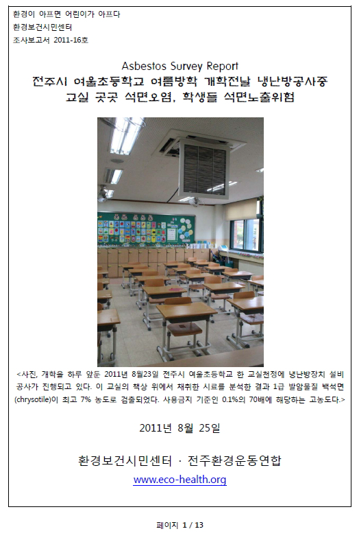 2011³â 8¿ù 23ÀÏ ÀüÁֽà ¿©¿ïÃʵîÇб³ ÇÑ ±³½ÇõÁ¤¿¡ ³Ã³­¹æÀåÄ¡ ¼³ºñ°ø»ç°¡ ÁøÇàµÇ¾ú´Âµ¥, ÀÌ ±³½ÇÀÇ Ã¥»ó À§¿¡¼­ äÃëÇÑ ½Ã·á¸¦ ºÐ¼®ÇÑ °á°ú ¹é¼®¸éÀÌ ÃÖ°í 7% ³óµµ·Î °ËÃâµÇ¾ú´Ù°í ÇÕ´Ï´Ù.