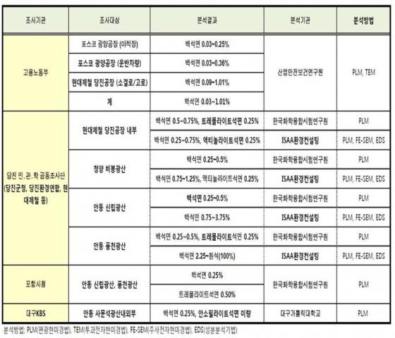 ³ëµ¿ºÎ°¡ ±¹È¸¿¡ Á¦ÃâÇÑ ÀÚ·á¿¡ ÀÇÇÏ¸é Æ÷½ºÄÚ ±¤¾ç°øÀå ¾ßÀûÀå¿¡¼ äÃëÇÑ 5°³ ½Ã·á¿¡¼ ¹é¼®¸é 0.03~0.25%, ¿î¹ÝÂ÷·®ÀÇ 4°³ ½Ã·á¿¡¼ ¹é¼®¸é 0.03~0.36%°¡ °ËÃâµÇ¾ú´Ù. Çö´ëÁ¦Ã¶ ´çÁø°øÀåÀÇ ¼Ò°á·Î/°í·ÎÀÇ 5°³ ½Ã·á¿¡¼ ¹é¼®¸é 0.09~1.01%°¡ °ËÃâµÇ¾ú´Ù. Æ÷½ºÄÚ Æ÷Ç×Á¦Ã¶¼Ò°¡ À§Ä¡ÇÑ °æºÏ Æ÷Ç×½ÃÀÇ °æ¿ì ½ÃûÀÌ Á÷Á¢ µÎ°³ÀÇ »ç¹®¼®±¤»ê°ú ¿î¹Ý°æ·Î»ó¿¡¼ äÃëÇÑ »ç¹®¼®½Ã·á¿¡¼ ¹é¼®¸é 0.25%, Æ®·¹¸ô¶óÀÌÆ®¼®¸é 0.5%°¡ °ËÃâµÇ¾ú´Ù. ¶Ç Çö´ëÁ¦Ã¶ÀÌ À§Ä¡ÇÑ Ãæ³² ´çÁø±ºÀÇ °æ¿ì ±ºÃ»ÀÌ ¹Î°üÇÐÇÕµ¿À¸·Î ½Ç½ÃÇÑ Á¶»ç¿¡¼´Â ¸ðµÎ 14°³ÀÇ ½Ã·áÁß 12°³¿¡¼ ¹é¼®¸é°ú Æ®·¹¸ô¶óÀÌÆ®¼®¸é ±×¸®°í ¾×Ƽ³î¶óÀÌÆ®¼®¸é µî 3Á¾ÀÌ °ËÃâµÇ¾ú´Ù. ´çÁø¹Î°üÇаøµ¿Á¶»ç´Â Çö´ëÁ¦Ã¶°ú ȯ°æ´Üü°¡ °¢°¢ ÃßÀüÇÑ µÎ °÷ÀÇ ºÐ¼®±â°ü¿¡ °°Àº ½Ã·á°¡ º¸³»Á® ºÐ¼®µÇ¾ú´Âµ¥ ºñ½ÁÇÑ °á°ú°¡ ³ª¿Ô´Ù. ÀÌ·Î½á ¼®¸éÀÌ ÇÔÀ¯µÇÁö ¾Ê¾Ò´Ù°í ºÎÀÎÇÑ ´çÃÊ Æ÷½ºÄÚ¿Í Çö´ëÁ¦Ã¶ ÃøÀÇ ÁÖÀåÀÌ °ÅÁþÀ̾úÀ½ÀÌ Á¤ºÎ´ç±¹ÀÇ Á¶»ç¸¦ ÅëÇØ È®ÀεǾú´Ù.